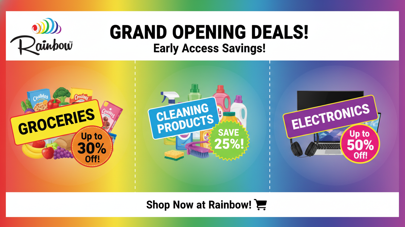 Rainbow offers exclusive opening deals across a variety of categories, including groceries, electronics, home essentials, and more. These early-bird promotions are a fantastic opportunity to stock up and save big.